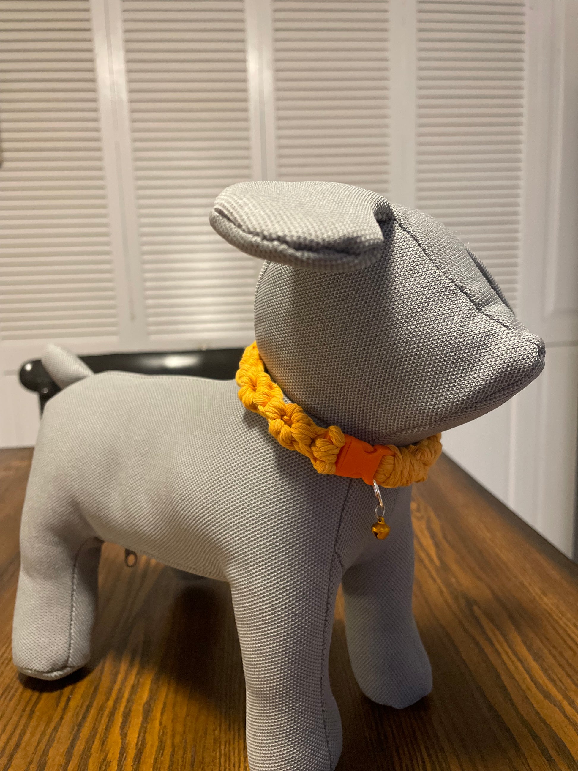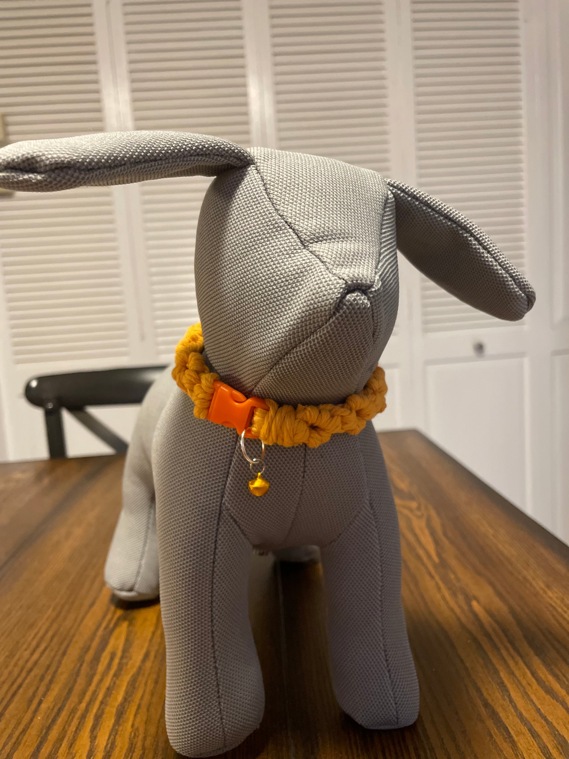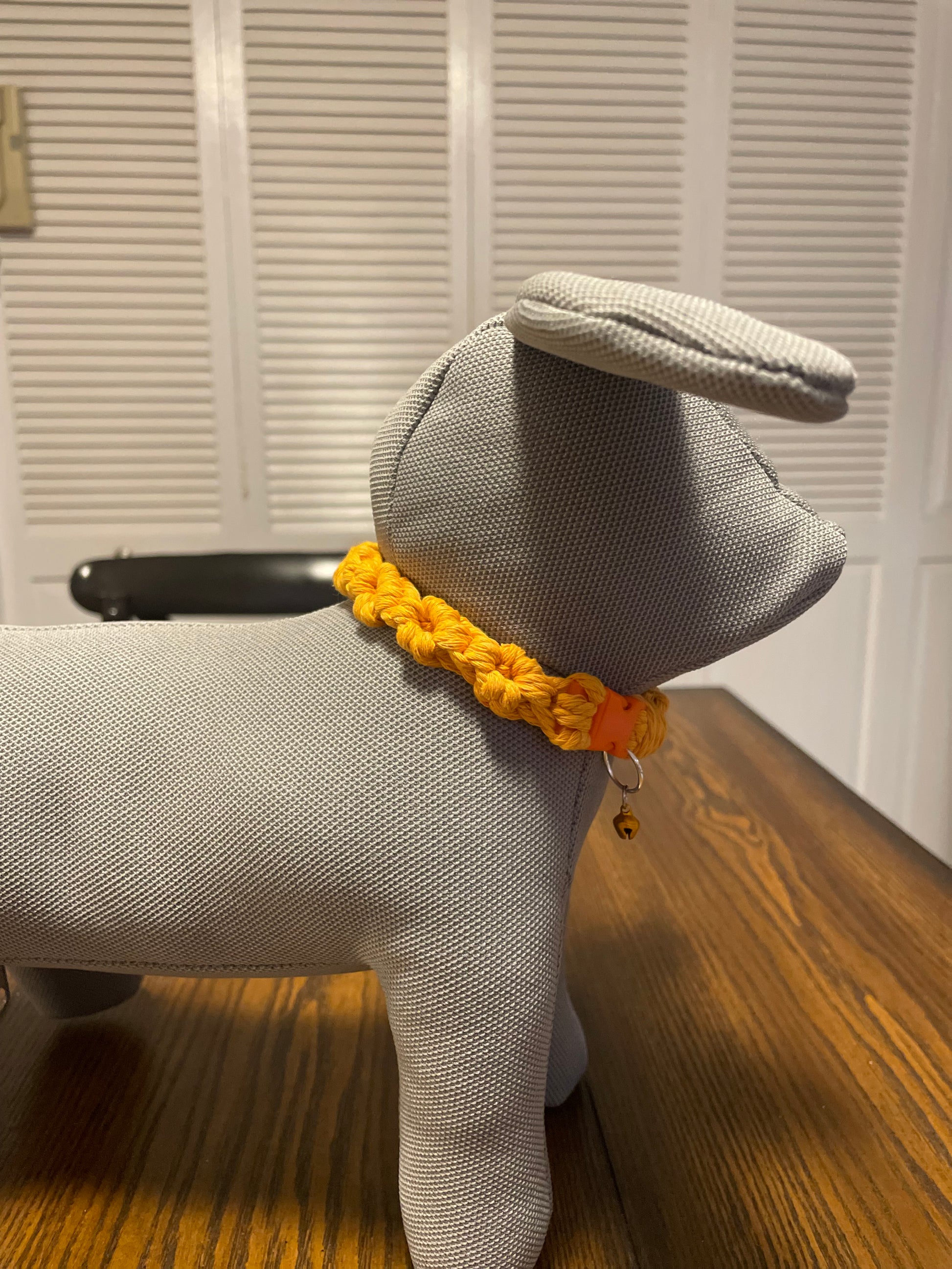 Collar tejido a mano para mascota pequeña con broche de plástico naranja con aro de plata con cascabel naranja. 26 cm de largo.