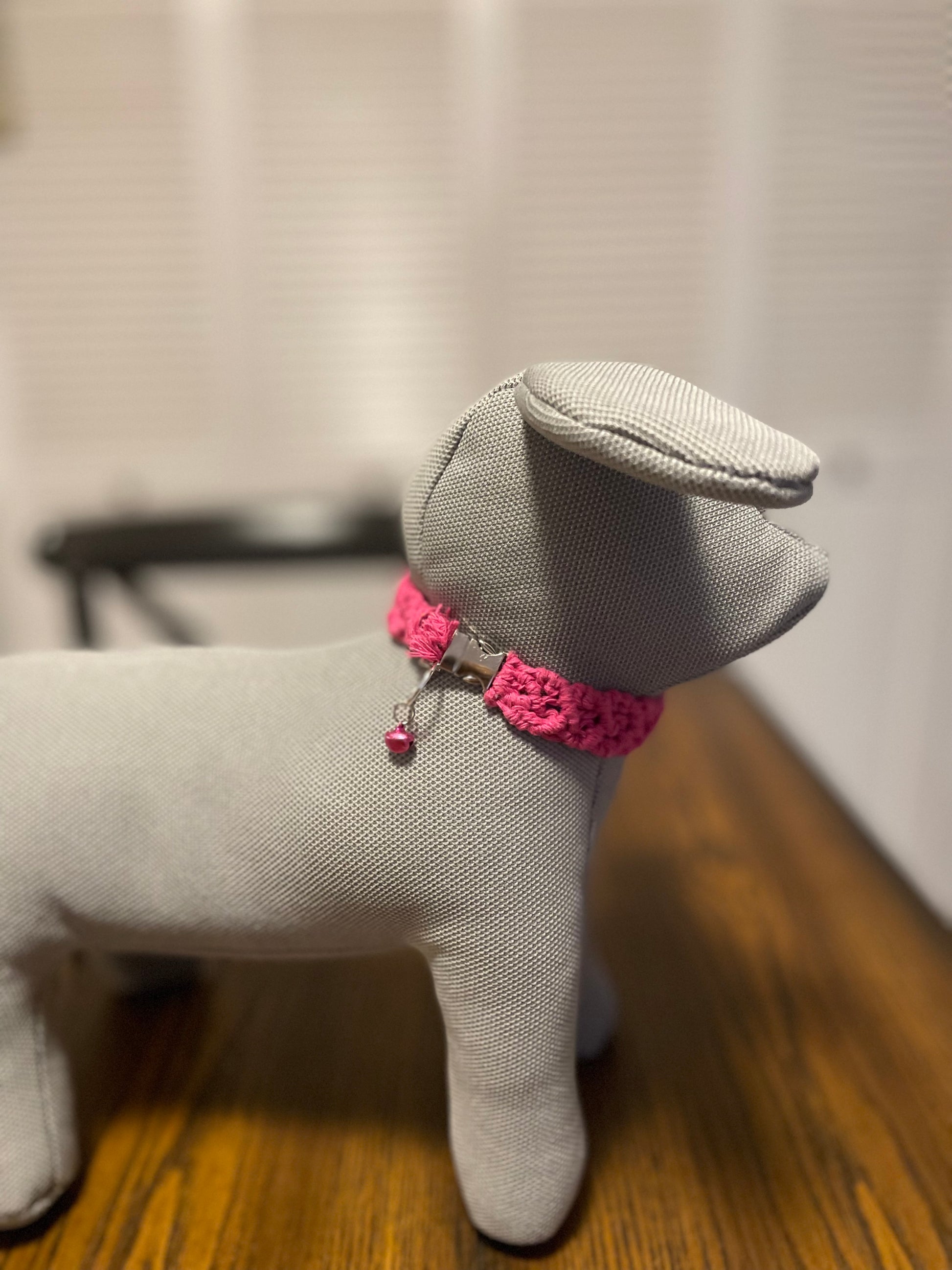 Collar tejido a mano para mascota pequeña con broche de plata con aro con cascabel rosa. 26 cm de largo.